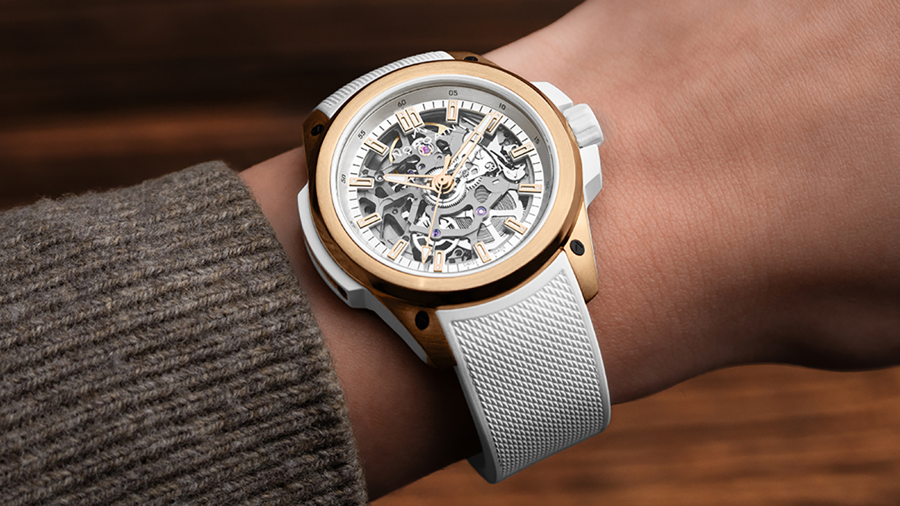 Die Wild One Skeleton Yellow Gold (limitiert) und die Wild One Skeleton Red Gold kommen im 39mm großen Goldgehäuse, wobei lediglich der Oberteil aus Gold - genau gesagt aus PC Impact® Gold – ausgeführt ist. Der Mittelteil und der Gehäuseboden sind aus sandgestrahltem Titan (Container) und aus Norqains eigenem Karbonfaser-Material.